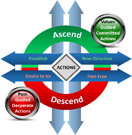 Committed Actions: Patients are encouraged to think small and make repeated values guided actions which will stop them descending into despair and supports a new direction, ascend and aspire.
